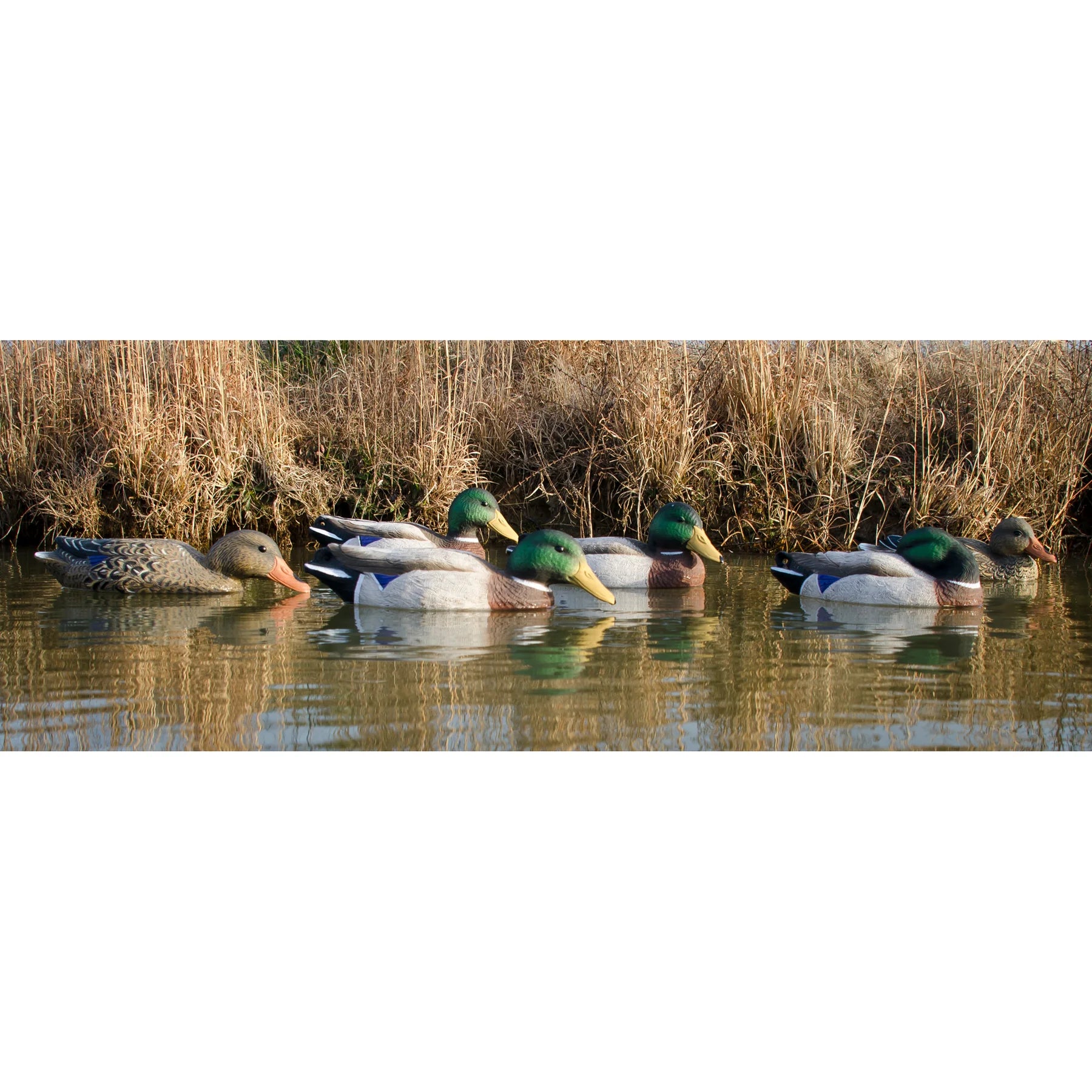 Realism has definitely been taken to the next level with this decoy package. This Full-Size mallard pack has all six decoys with different head positions including new skimmers, and a new sleeper drake! Drakes feature bright green heads with highly detailed feather carving. The Hens are masterfully carved with rich golden tones and bright contrast. Full-Size decoys are built to the average size of a live duck. These decoys are perfect for any duck hunter looking for amazing realism, natural size, and lightweight packability. These Full-Body Mallard decoys are a wonderful Value. Weighted keel for quick and easy set-up. Keel allows short stringing decoys for shallow water. Higdon's highly detailed, proprietary UV painting process and deep realistic carving techniques highlight each individual feather and minimize unnatural glare, even when decoys are wet. Our paint won't peel or fade, so your decoys will look great season after season. Package includes: 1 Upright Drake, 1 Skimmer Drake, 1 Resting Drake, 1 Sleeping Drake, 1 Relaxed Hen and 1 Skimmer Hen. As a Ducks Unlimited Official Licensed Product, a percentage of your purchase will go toward wetland conservation.