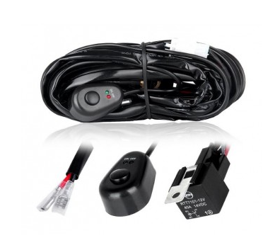 1x wiring loom harness kit with fuse and relay. Universal Harness kit with mouse style switch. On/off switch with adhesive tape backing for easy mounting. Blade fuse holder with replaceable 30A fuse.