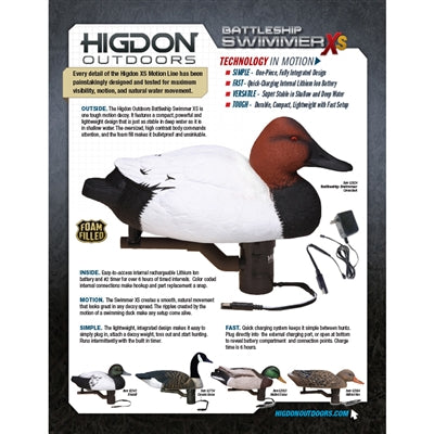 Higdon's New Battleship Swimmer PRO decoys have been meticulously upgraded to create more reliable, realistic motion and water ripple than ever before. Oversize, high contrast and foam filled, the already legendary performance of Higdon's Battleship Swimmer Pro decoys is now better than ever!